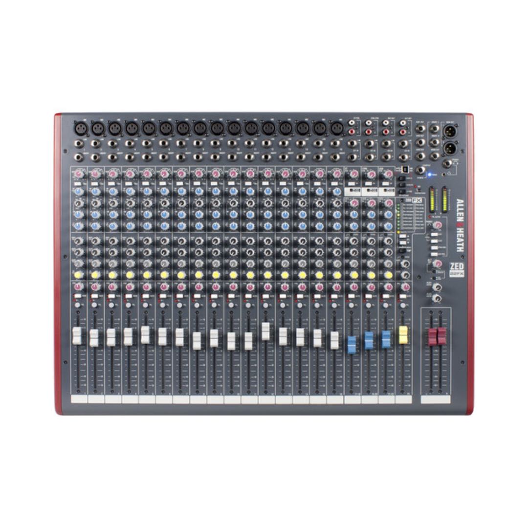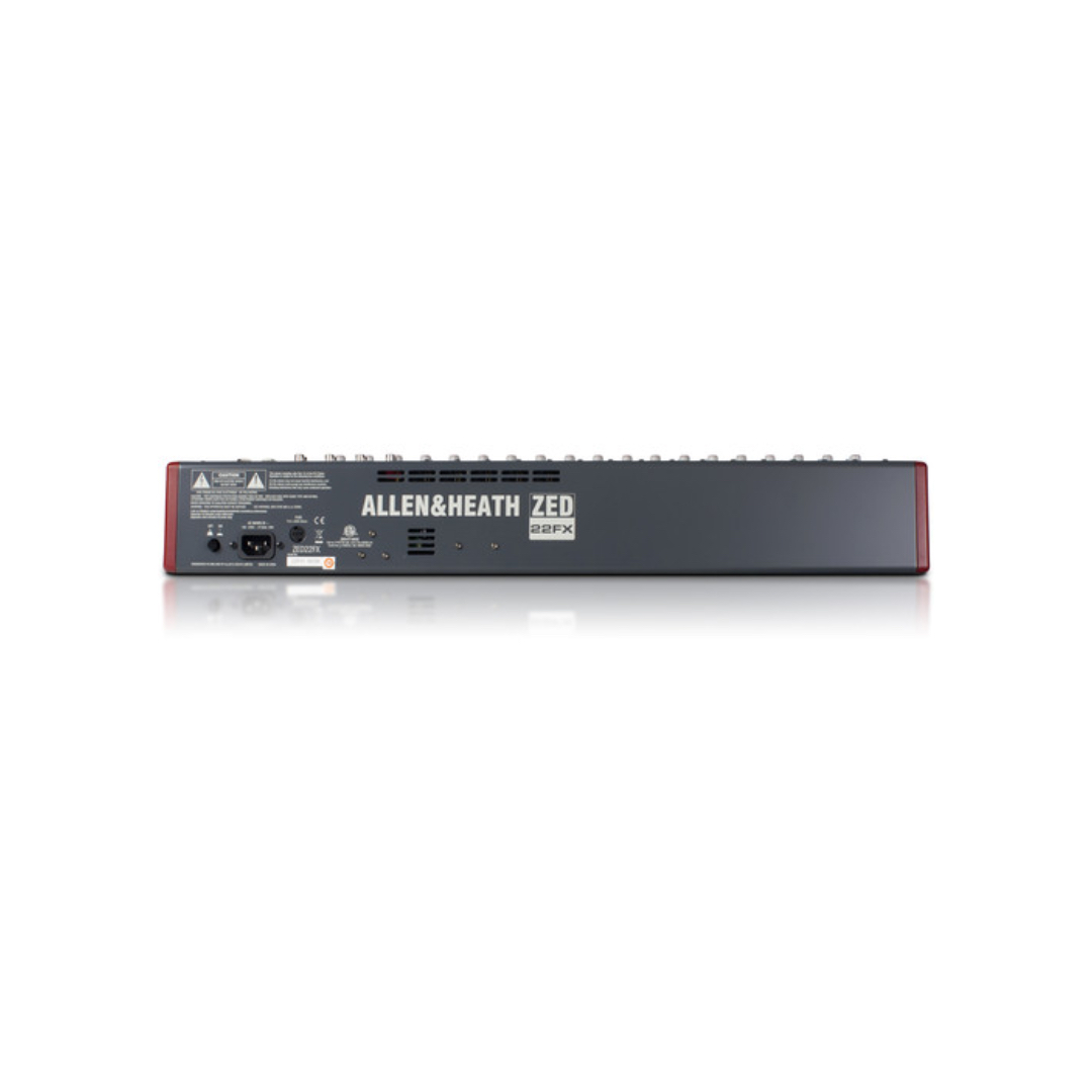 The Allen & Heath ZED-22FX is a 22-channel analog mixer offering versatile I/O and built-in effects for use in home and project studio recording, houses of worship, and live sound reinforcement. The 16 mono channels feature Neutrik XLR mic and 1/4″ line inputs, DuoPre preamps with phantom power and bountiful gain, 1/4″ insert points, and 3-band EQ, while the three stereo channels have 1/4″ inputs and 2-band EQ. All channels are equipped with long-throw 100mm faders, solo and mute buttons, and independent aux send knobs.