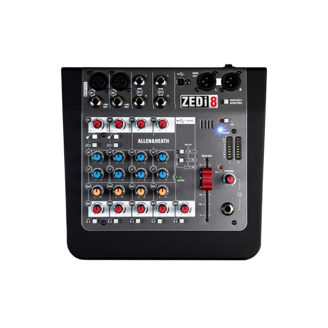 In the analog realm, the ZEDi-8 is crafted with preamps modeled on the Allen & Heath GS2-R24. These channel strips aim to provide warmth, low noise, and a vast expanse of headroom. On-board EQs also come standard with the unit. Two channels feature a button that converts line-level signal into high-impedance jacks, meaning guitar players need not lug an extra DI box around should they wish to go direct into the board.