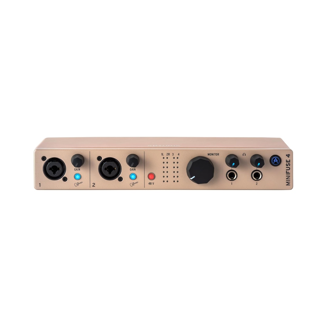 Meet the MiniFuse Champagne Edition range. The same rock-solid MiniFuse you rely on – pristine 110 dB dynamic range, ultra-low latency, loopback, and the stacked software bundle – now dressed in a sleek metallic Champagne finish and backed by Arturia’s premium quality build.