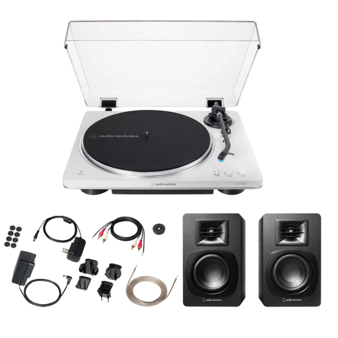 The Audio Technica LP70XBT-WS bundle pairs the fully automatic wireless belt-drive turntable in white silver finish with the SP3X powered speakers, creating a sleek, user-friendly vinyl listening system. The LP70XBT-WS supports Bluetooth 5.0 wireless streaming and includes a built-in phono preamp, allowing seamless integration with modern audio setups. Combined with the SP3X speakers’ robust 40 W total power and multiple input options, this bundle delivers high-quality sound with convenient connectivity.