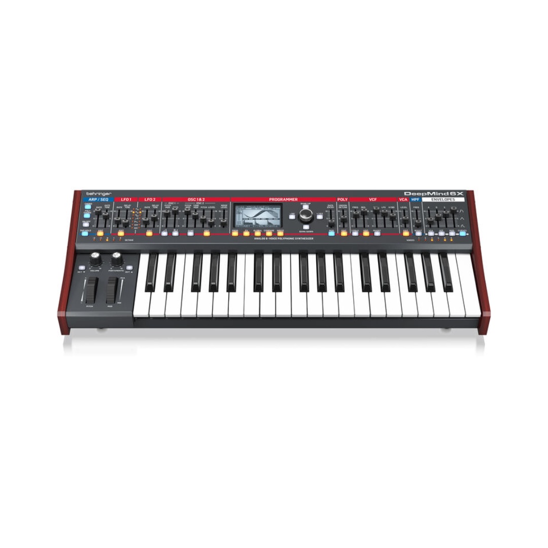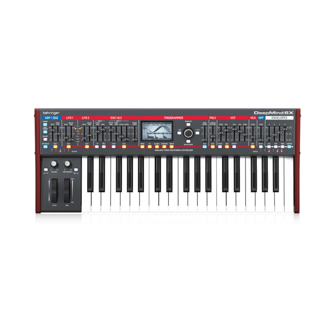 A versatile instrument for sound designers, producers, and performers alike, the Behringer DEEPMIND 6Xis a polyphonic true-analog synthesizer with an updated look that combines 37 semi-weighted full-size keys—featuring velocity sensitivity and aftertouch—with six voices of analog richness, digital effects, and a digital control interface to deliver a wide range of sounds, from classic analog tones to modern, experimental textures. DEEPMIND 6X’s core architecture includes dual analog oscillators and LFOs per voice, three ADSR envelopes, and a comprehensive 8-channel modulation matrix, providing deep, sonic manipulation capabilities. Four integrated effect engines drawing from TC Electronic, Midas, and Klark Teknik algorithms, offer a powerful suite of high-quality effect processors for instant sonic enhancements.