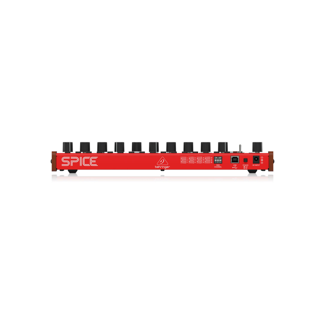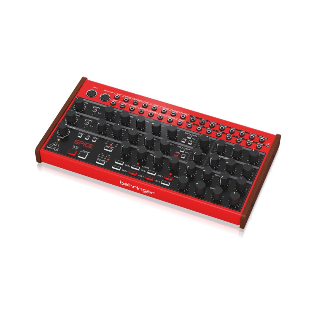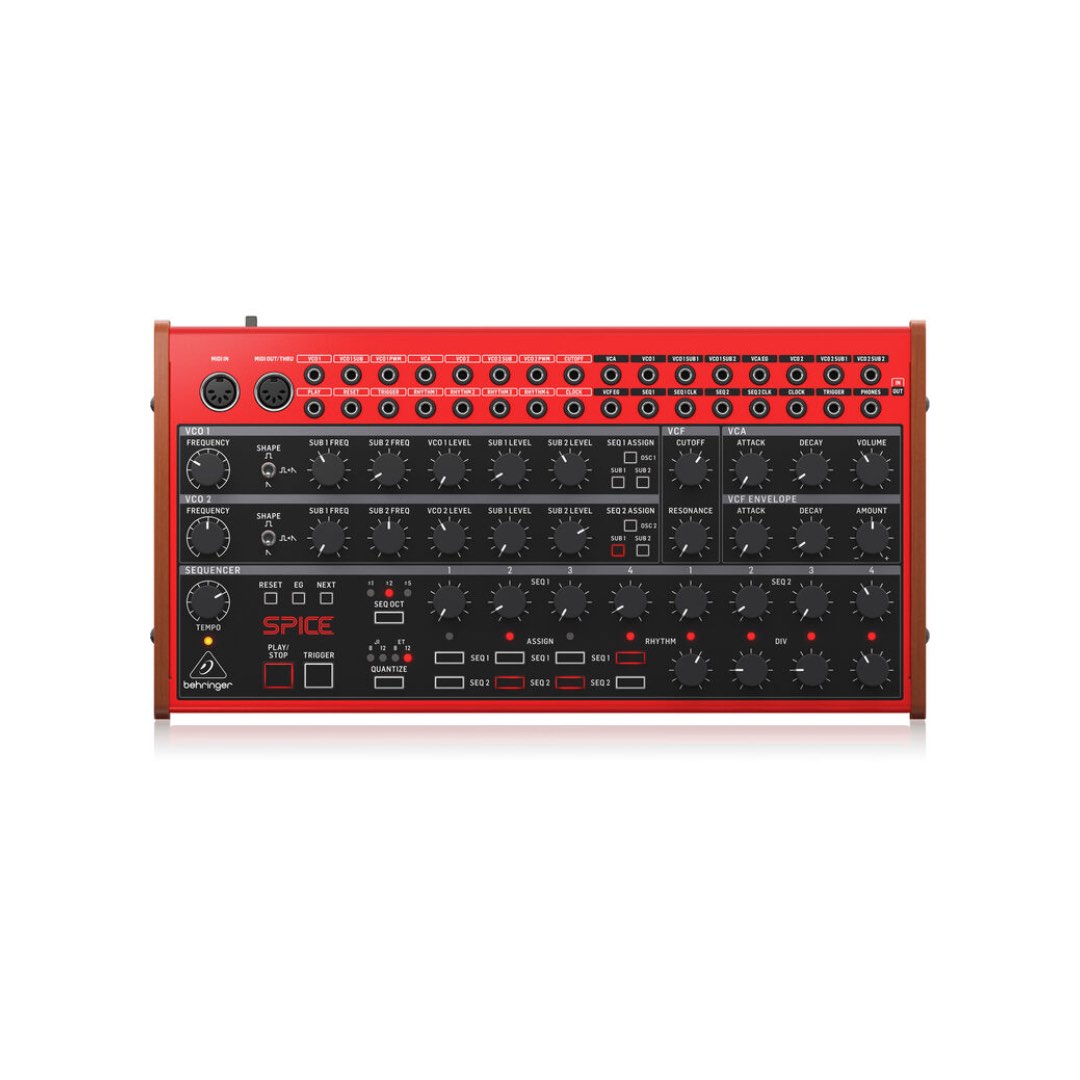 The Behringer SPICE is a fully analog, semi-modular polyrhythmic and subharmonic synthesizer designed to bring bold, complex, and inspiring sequences to your music production or modular setup. Combining dual VCOs, four sub-oscillators, a 24 dB resonant ladder filter, and an intuitive dual sequencer and polyrhythm generator, SPICE is engineered for sonic experimentation and rhythmic exploration.