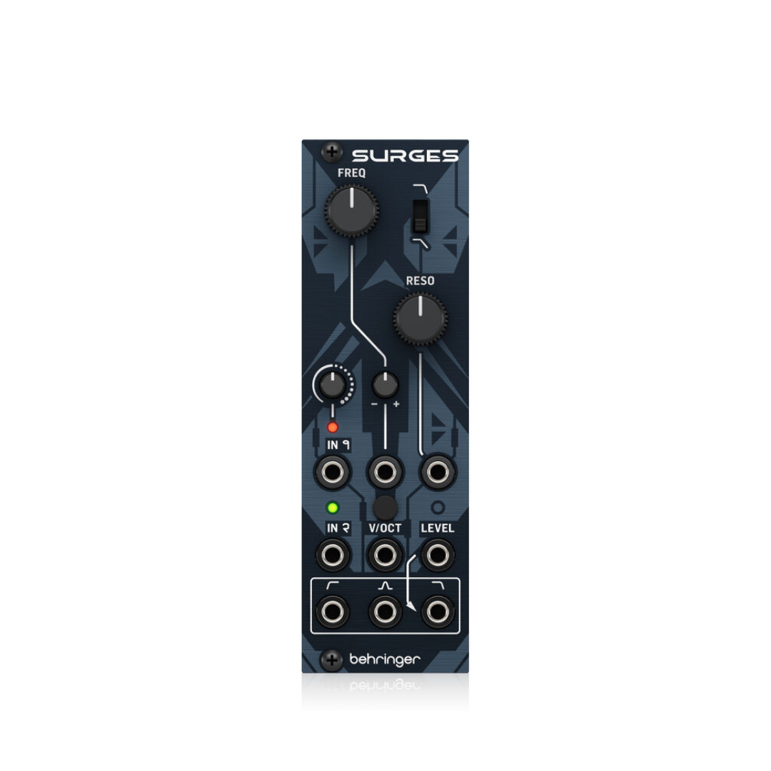 Add some vintage analog mojo to your modular setup with the Behringer SURGES, a multimode filter for Eurorack. Based on Mutable Instruments Ripples. SURGES is a voltage controlled filter capable of high-pass, band-pass, and low-pass output, with additional 2-pole or 4-pole settings for band- and low-pass. SURGES’ analog circuitry is based on legendary 2164 and 13700 semiconductors, used in vintage Roland synthesizers, including the SH and Jupiter series. SURGES ships with a ribbon power cable and screws.