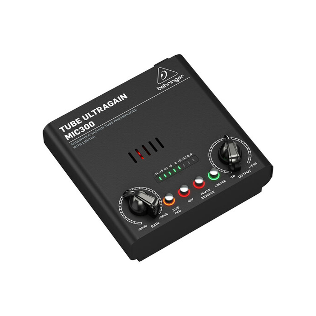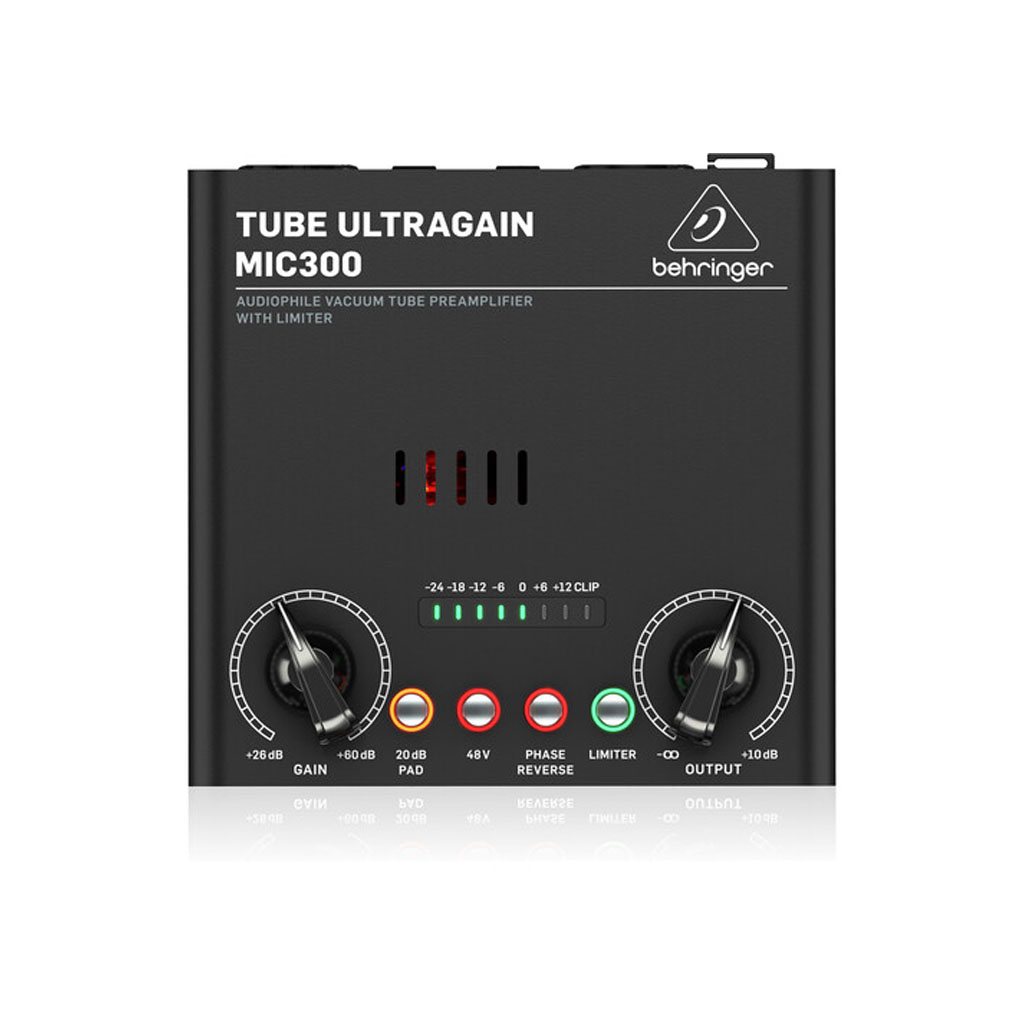 Inject character and depth into your recordings with the Behringer ULTRAGAIN MIC300, a high-end preamplifier for microphone, instrument, and line-level sources. The unit features a hand-selected 12AX7 vacuum tube for exceptional warmth and low noise, adding a vintage tube vibe to your production.