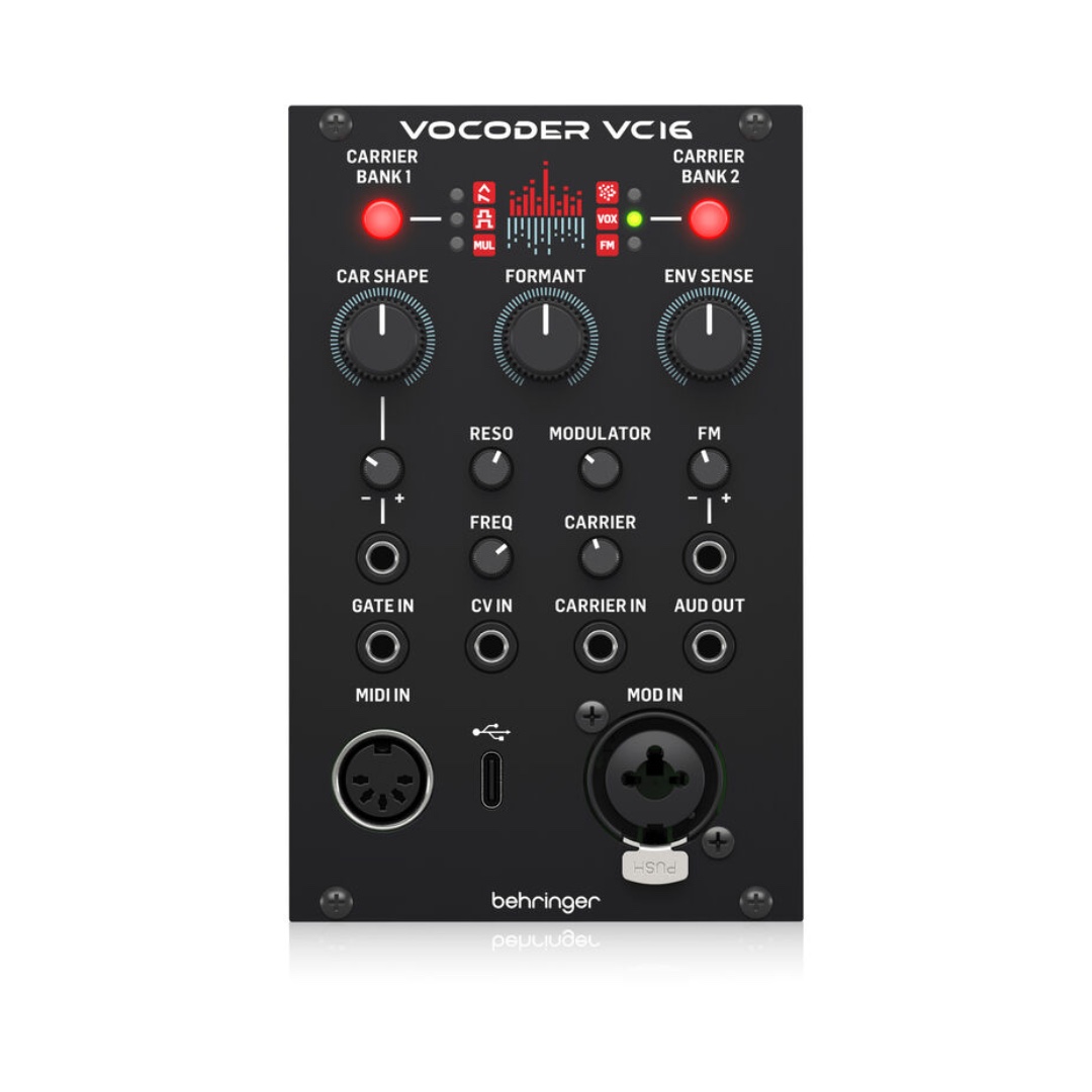 Create rock’in robot voices and more with the Behringer VOCODER VC16, a powerful vocoder module in Eurorack format. The VC16 combines six powerful synthesis engines with 3 voices of polyphony and 6 digital oscillators. The module provides four controls for precise vocoder response and sound modeling. There are external inputs for an external carrier and modulator inputs. The MIDI input allows you to interface with other instruments. The VC16 includes a power ribbon cable and mounting screws.