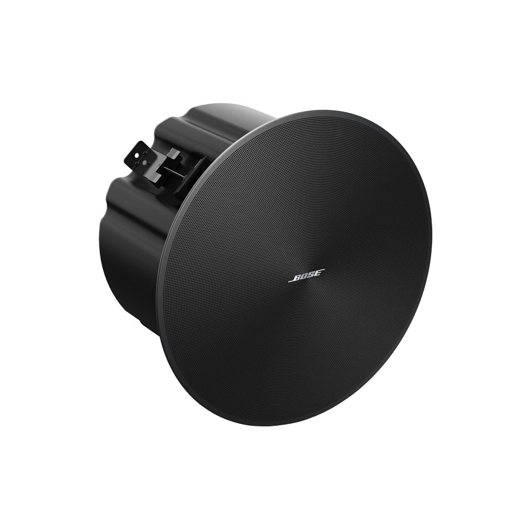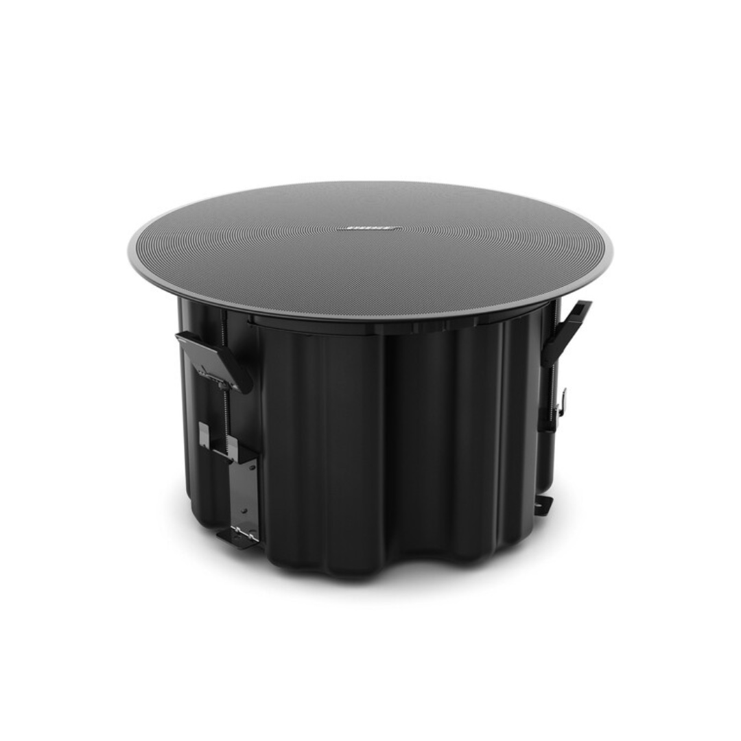 In black, the DesignMax DM8C from Bose Professional is a single 150W in-ceiling speaker that delivers powerful SPL suitable for foreground music. It features coaxial two-way drivers and a two-way 8″ woofer. The DM8C has a center-firing coaxial 1″ compression driver and a 52 Hz to 20 kHz frequency range. It’s easily installed via integrated QuickHold mounting arms.