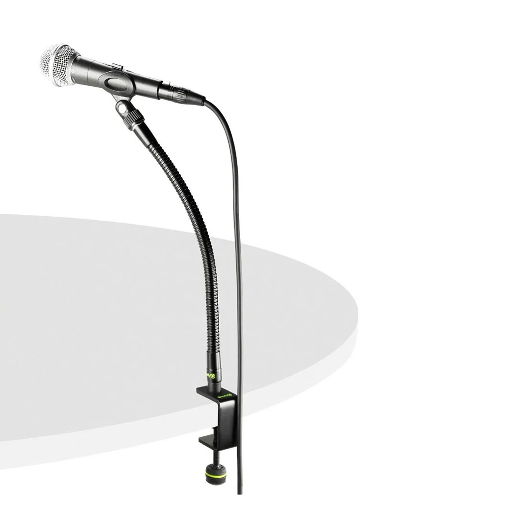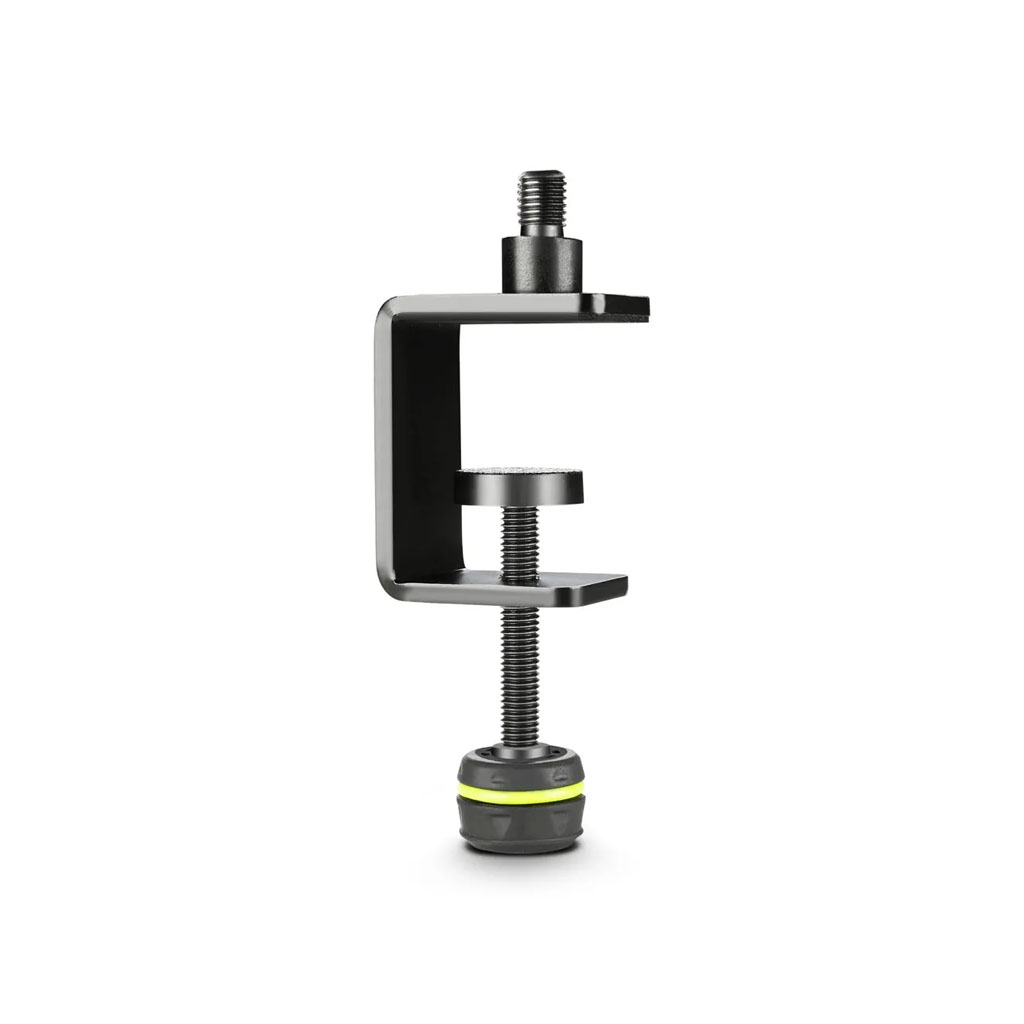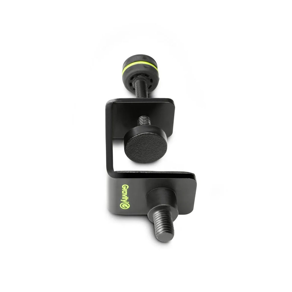 The Gravity MSTM 1 B microphone table clamp firmly attaches to desk or podium tops with a maximum thickness of 45 mm. It is made of 4 mm steel with a plastic tipped set screw and 3/8″ threaded bolt for mic clip, mic clamp or gooseneck mounting.