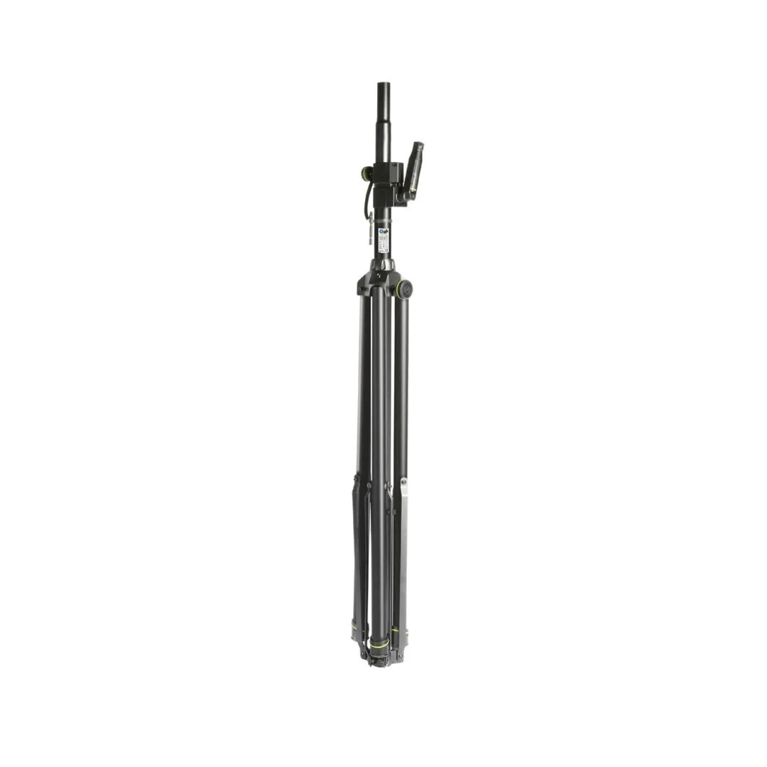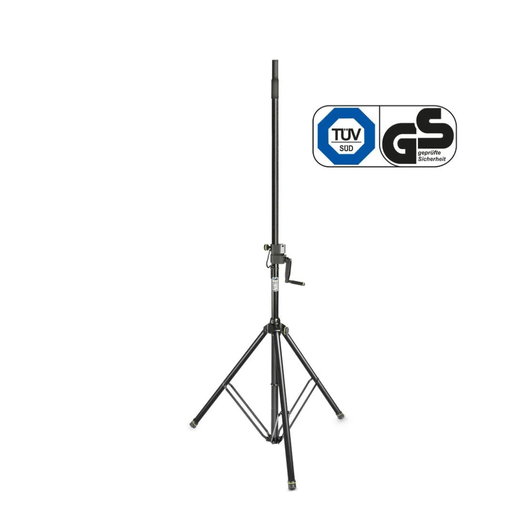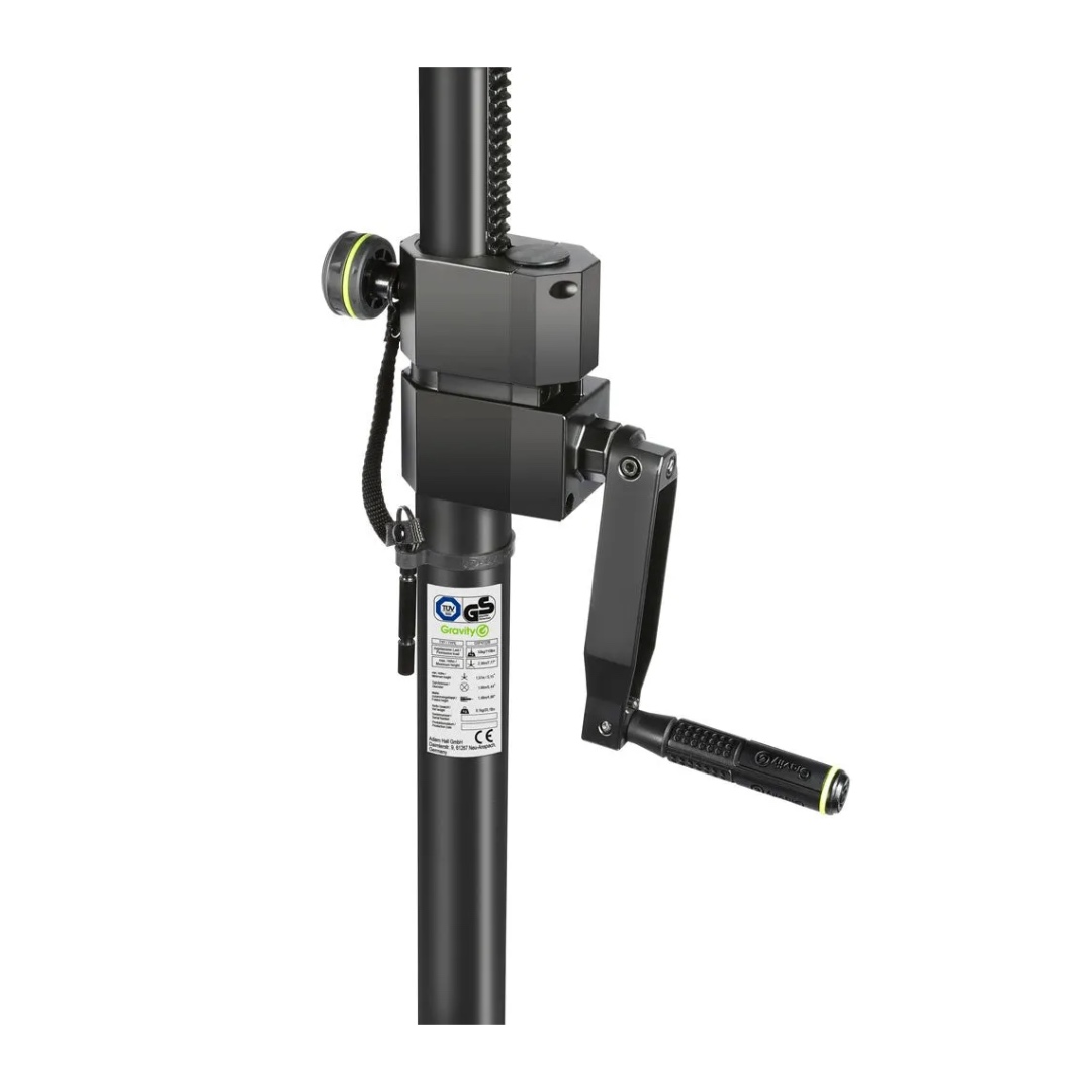 The Gravity GSP 4722 B is a heavy-duty speaker stand with a convenient hand crank and rack and pinion that make it easy to raise your speakers to the desired height. It is made of hard-wearing steel tubing with a folding tripod base and durable cast aluminium leg collar. A large knob set screw and safety pin secure the telescoping pole, which extends from 1.5 m to a maximum height of 2.4 m. The stand is TÜV/GS certified.