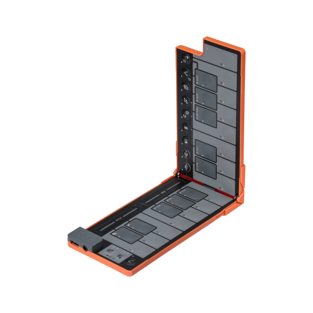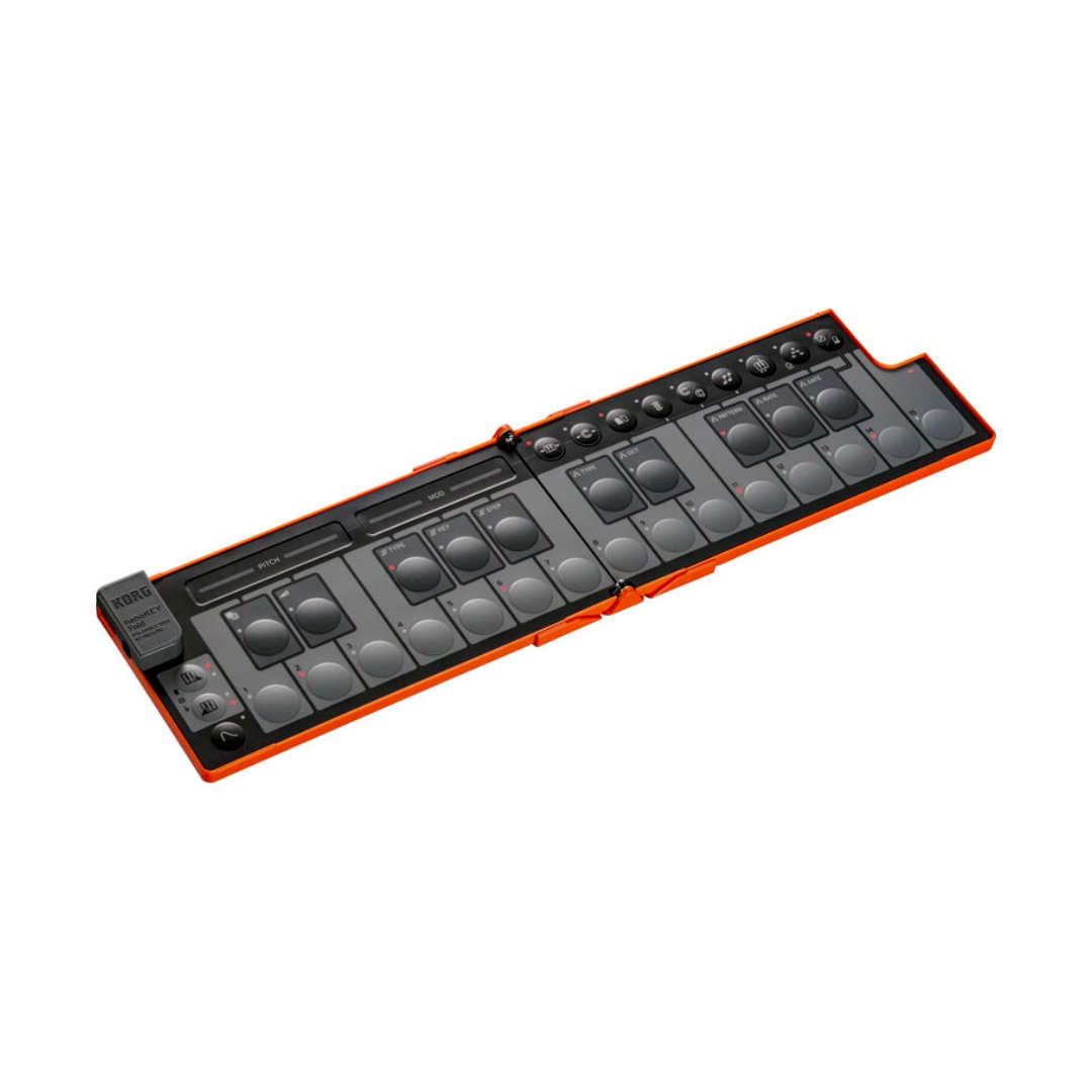 Revolutionize your mobile music production experience with the orange Korg nanoKEY Fold, a foldable MIDI keyboard controller that’s your go-to tool for capturing creative bursts on the fly. With its smartphone-sized body, the nanoKEY Fold not only is portable, but packed with loads of features and control optons.