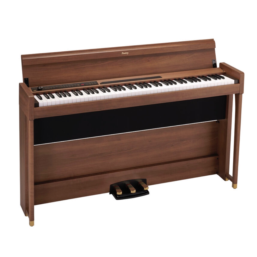 The Korg Poetry Console Digital Piano is an elegant, Chopin-inspired digital piano that will surely catch the eye of Romantic-music aficionados as well as piano teachers and students. Poetry offers the authentic sounds of two distinct grand pianos: Chopin’s cherished 1843 PLEYEL and an Italian piano featured in the 2021 Chopin Competition. The 88-note RH3 Hammer Action Keybed is premium-graded and offers a highly realistic playing response for experienced and amateur players alike. The RH3 keybed is skillfully manufactured in Kyoto, Japan, ensuring superb build quality and long-term reliability.Poetry comes with full Bluetooth connectivity for streaming audio and playing along. The newly developed 50W speaker system, coupled with Acoustage Bass technology, provides a powerful and resonant room-filling sound. Enhance your practice with features like metronome, layers, and partner mode, and instantly record your performance with the 2-part song recorder. Featuring a stylish console with wood grain finish, gold accents, and curved wooden legs, and with 50 demos of renowned Chopin masterpieces curated on the piano itself, Poetry offers an irresistible gateway into the evocative musical world of the Romantic era.