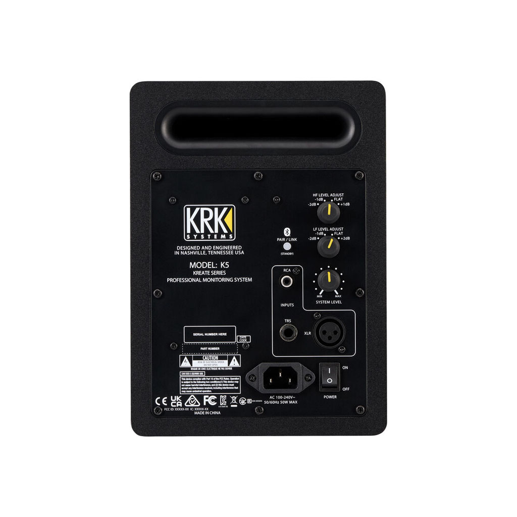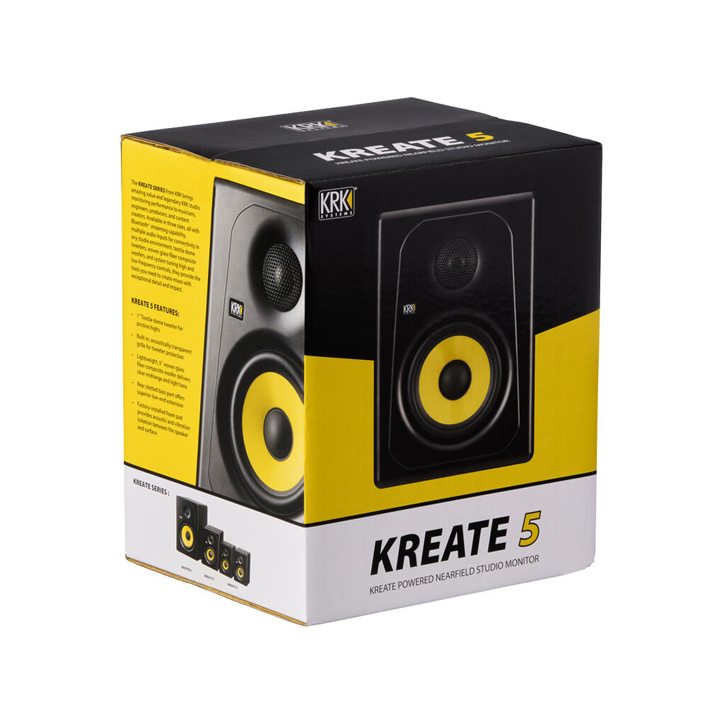 The KRK Kreate 5 is a budget-friendly studio monitor that builds on the success of KRK’s popular Classic Series, now enhanced with Bluetooth connectivity. This near-field, active monitor delivers the renowned KRK sound, famed for its clarity, transparency, and vibrancy. Kreate 5 offers 55W of bi-amped, Class-AB amplification that powers a 5″ glass aramid woofer and a 1″ textile-dome tweeter, ensuring accurate frequency response and reliable performance for precision monitoring. Dedicated level, high-frequency, and low-frequency controls aid in tuning your monitor for your specific acoustic environment.