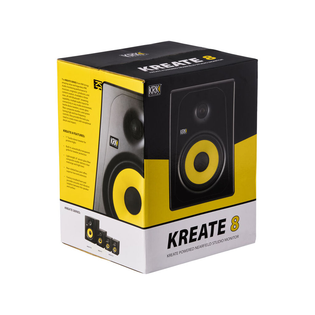 The KRK Kreate 8 is a budget-friendly studio monitor that builds on the success of KRK’s popular Classic Series, now enhanced with Bluetooth connectivity. This near-field, active monitor delivers the renowned KRK sound famed for its clarity, transparency, and vibrancy. Kreate 8 offers 100W bi-amped, Class-AB amplification that powers an 8″ glass aramid woofer and a 1″ textile-dome tweeter, ensuring accurate frequency response and reliable performance for precision monitoring. Dedicated Level, high-frequency, and low-frequency controls aid in tuning your monitor for your specific acoustic environment.