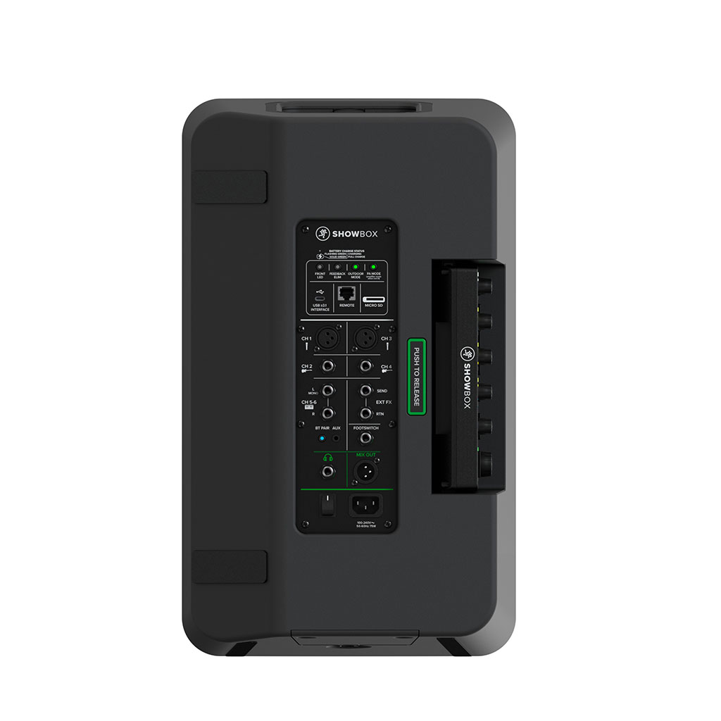 The ShowBox breakaway mix controller gives you real-time control of your sound, including levels, effects and tone shaping, snapshots, built-in looper, tuner, and SD recording. The controller mounts to your stand with included hardware, and slides into the speaker for storage. Take your performance online with a USB-C interface for streaming and recording, while playing over backing tracks via Bluetooth. The internal battery provides up to 12 hours of use. The ShowBox includes a mix controller mic clip, a 16′ CAT6 cable for connecting the mix controller, and a standard IEC power cord.