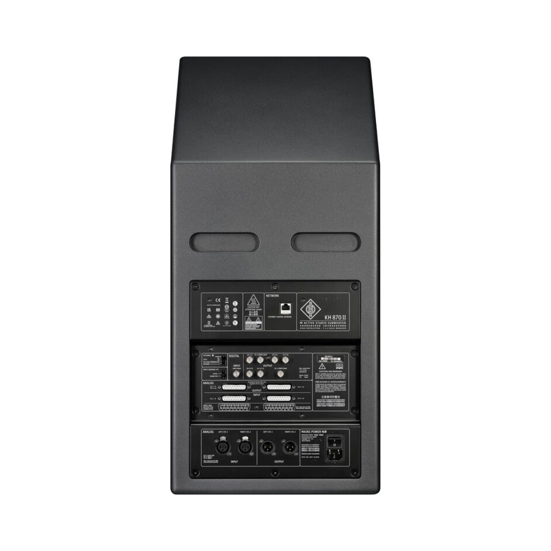 The subwoofer features a Flexible Bass Manager that integrates seamlessly into monitoring systems of all sizes. Acting as a signal hub for up to 7.1.4 systems, it supports surround and immersive formats with exceptional accuracy. Multiple acoustic controls, system volume management, and comprehensive connectivity options make it easy to integrate into both new and existing monitoring environments. For large-scale facilities or immersive studios, the KH 870 II provides the headroom and scalability required for today’s advanced workflows.