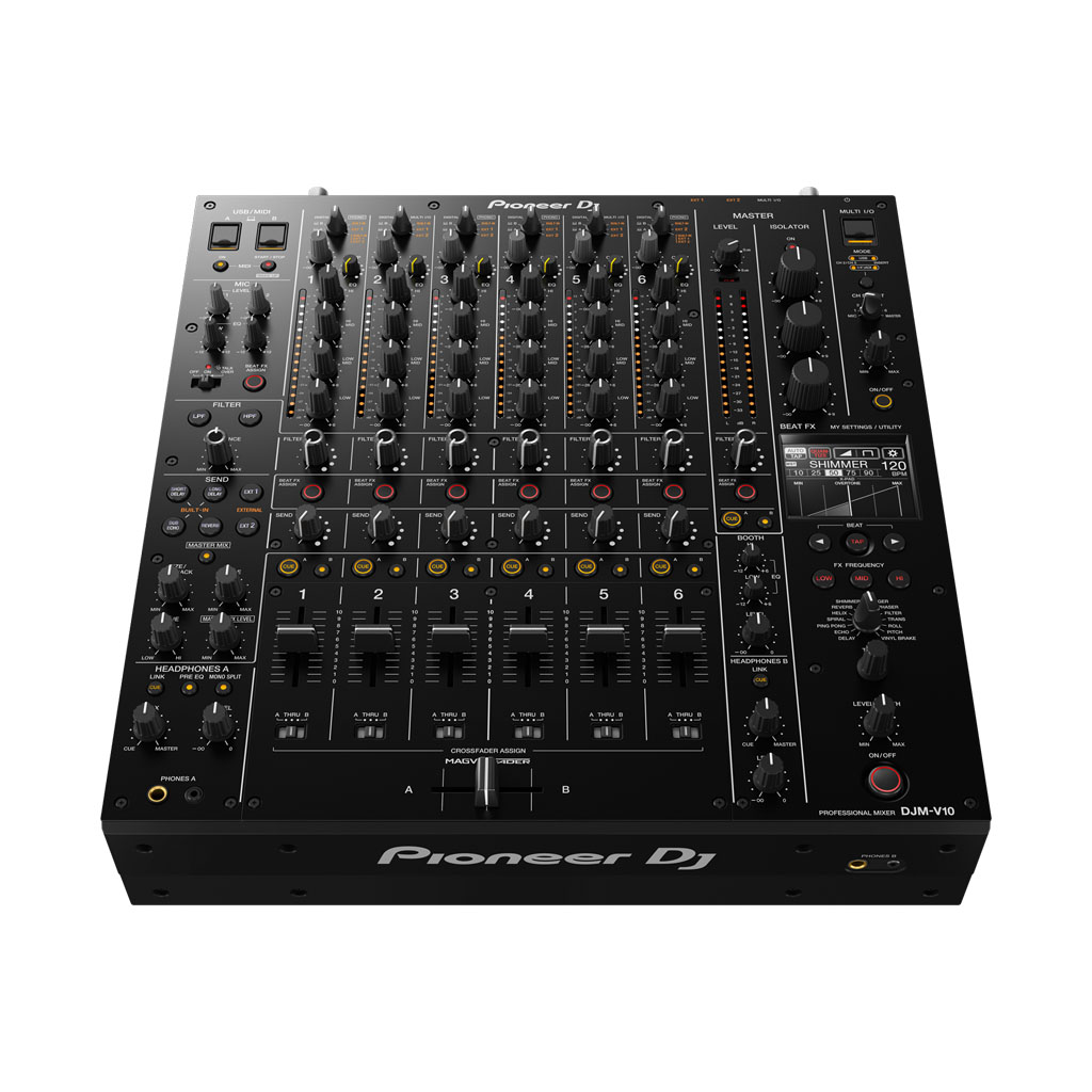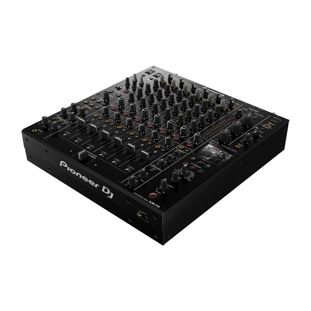 There are four inputs for turntables and six line-level inputs for digital decks. Additional features include Pro DJ Link, six S/PDIF digital input connections, one AES/EBU digital output connection, a DIN MIDI output for synchronizing external hardware effects and sequencers, two top-mounted USB connections, and an additional USB port that supports iOS devices for use with Pioneer’s optional RMX-1000 for iPad. An independent send-and-return section allows for external effects to be used simultaneously with the internal effects. The DJM-V10 ships with a power cord.