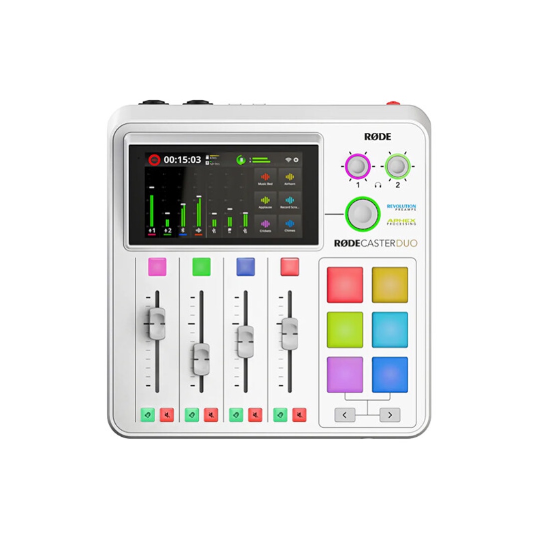 Designed to elevate your podcasting, and your streaming, music-making, and content creation, the white RODECaster Duofrom RODE is a compact and powerful all-in-one audio production solution that delivers all the same revered features and versatility of the RODECaster Pro II in a smaller, more portable form factor. Perfect for those who require fewer audio inputs and a more travel-friendly design, the RODECaster Duo sacrifices none of the qualities or functionalities of its larger sibling, sporting the same high-powered quad-core audio engine, high-gain, low-noise Revolution preamps, APHEX audio processing, and flexible customization.The RODECaster Duo features two XLR-1/4″ combo inputs for mic- or line-level signals, one stereo pair line output for speakers, two headphone outputs, a microSD card reader for internal multitrack recording, two USB-C host connections, and an ethernet network terminal for hardware or software integrations. Just like the RCPII, you also get intuitive hands on control, such as four assignable mixer faders, six colorful customizable SMART pads for audio, FX, and MIDI triggering, a bright colorful touchscreen, and plenty of buttons and knobs to create engaging content of almost any kind. The RODECaster Duo includes Bluetooth technology and integrated wireless microphone receivers for onboard compatibility with the RODE Wireless GO II and Wireless ME, allowing you to handle just about any usage scenario and any workflow, anywhere.