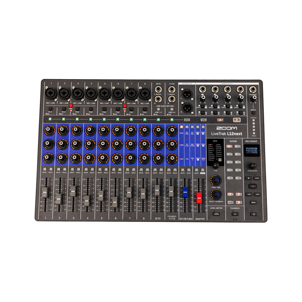 Combining the powers of a digital mixer and multitrack recorder with analog-style control, the Zoom LiveTrak L12next is a 12-channel digital mixer with integrated 14-channel recording and 14×4 USB-C interface functionality. Sporting five independent output mixes for five monitoring destinations, the L12next is ideal for live performances and streaming.